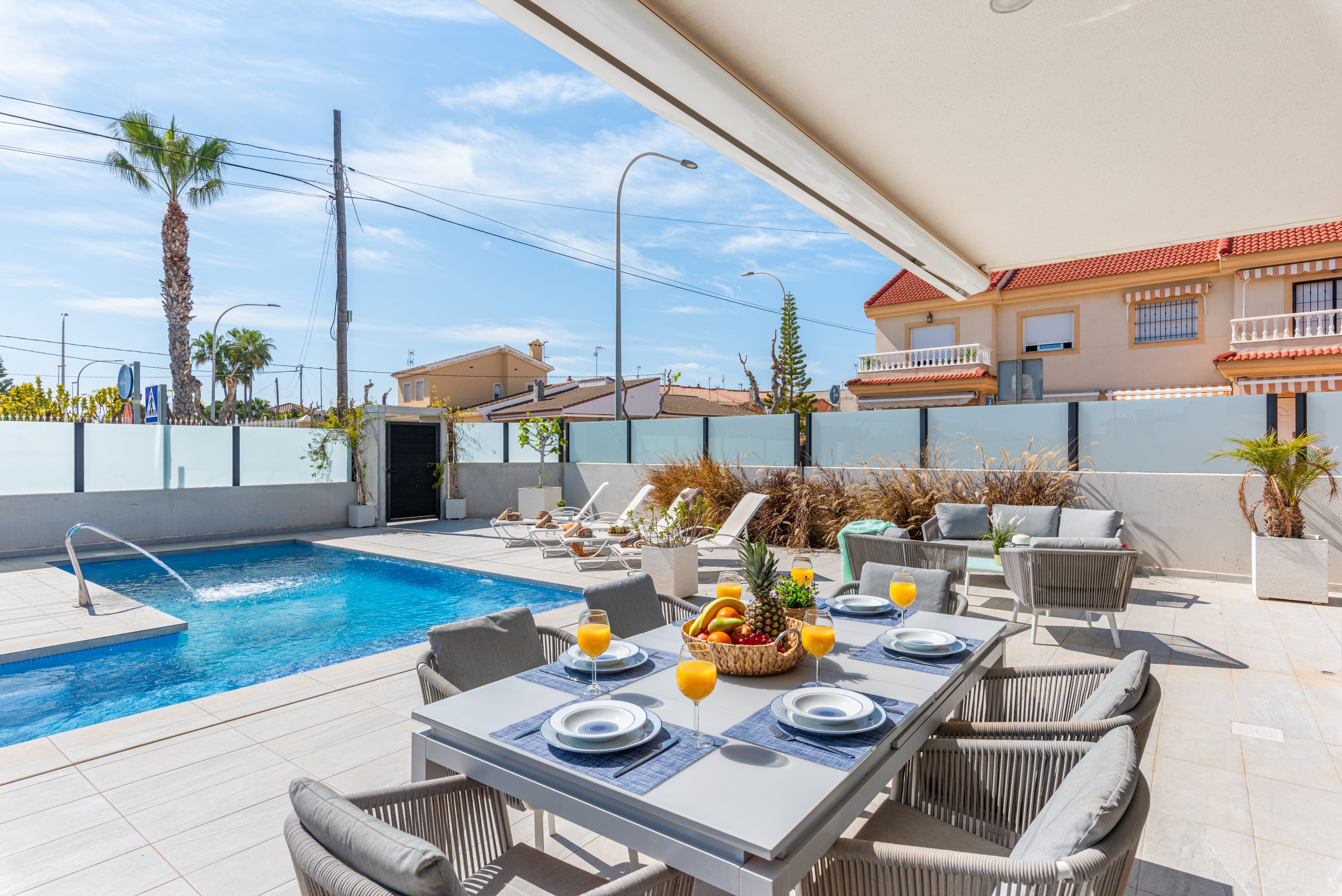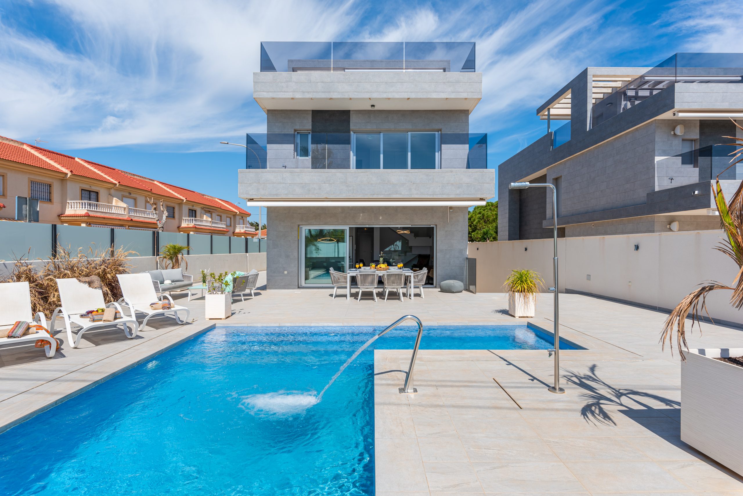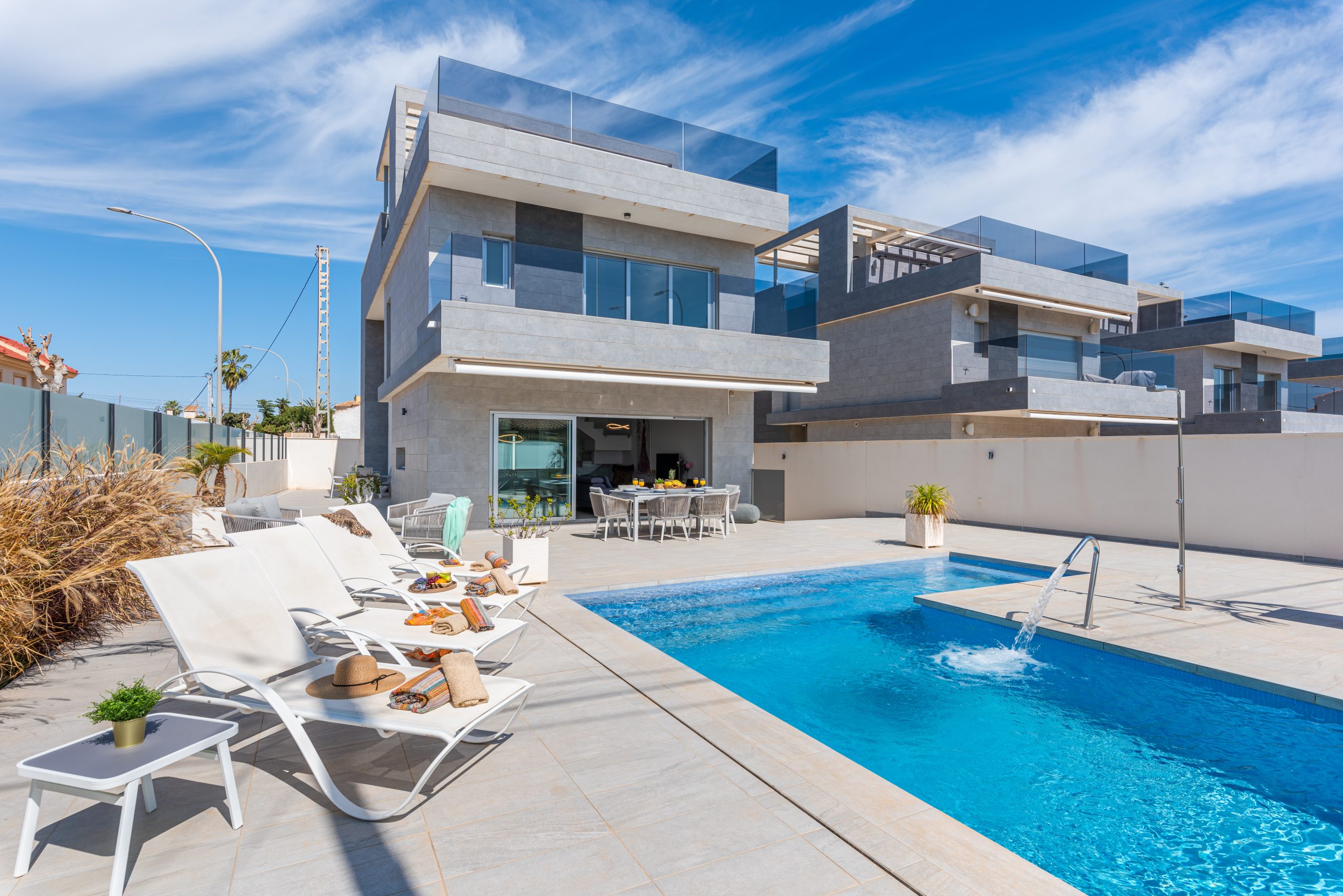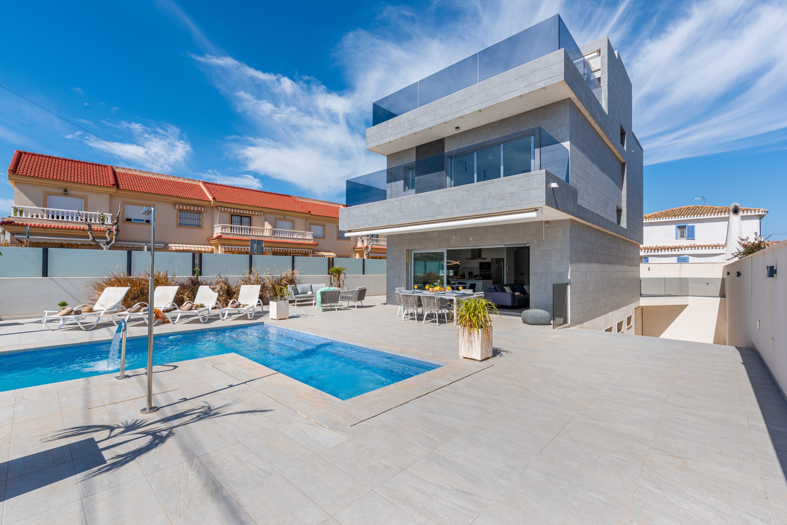 A fantastic five bedroom detached Villa with private pool and spacious terraces both on ground level and on the solarium. The décor is modern, and it is equipped to a very high standard. Located in the sort after town of Torre de la Horadada, just three minutes walk from the golden beaches and the marina. There are numerous bars and restaurants within walking distance, and Latino Square with its array of international restaurants is just a few minutes away. The main town of Pilar Horadada is only five minutes away with supermarkets, a cinema and sports facilities. Air-conditioning, Wi-Fi, and both Scandinavian and English TV are available in this property.