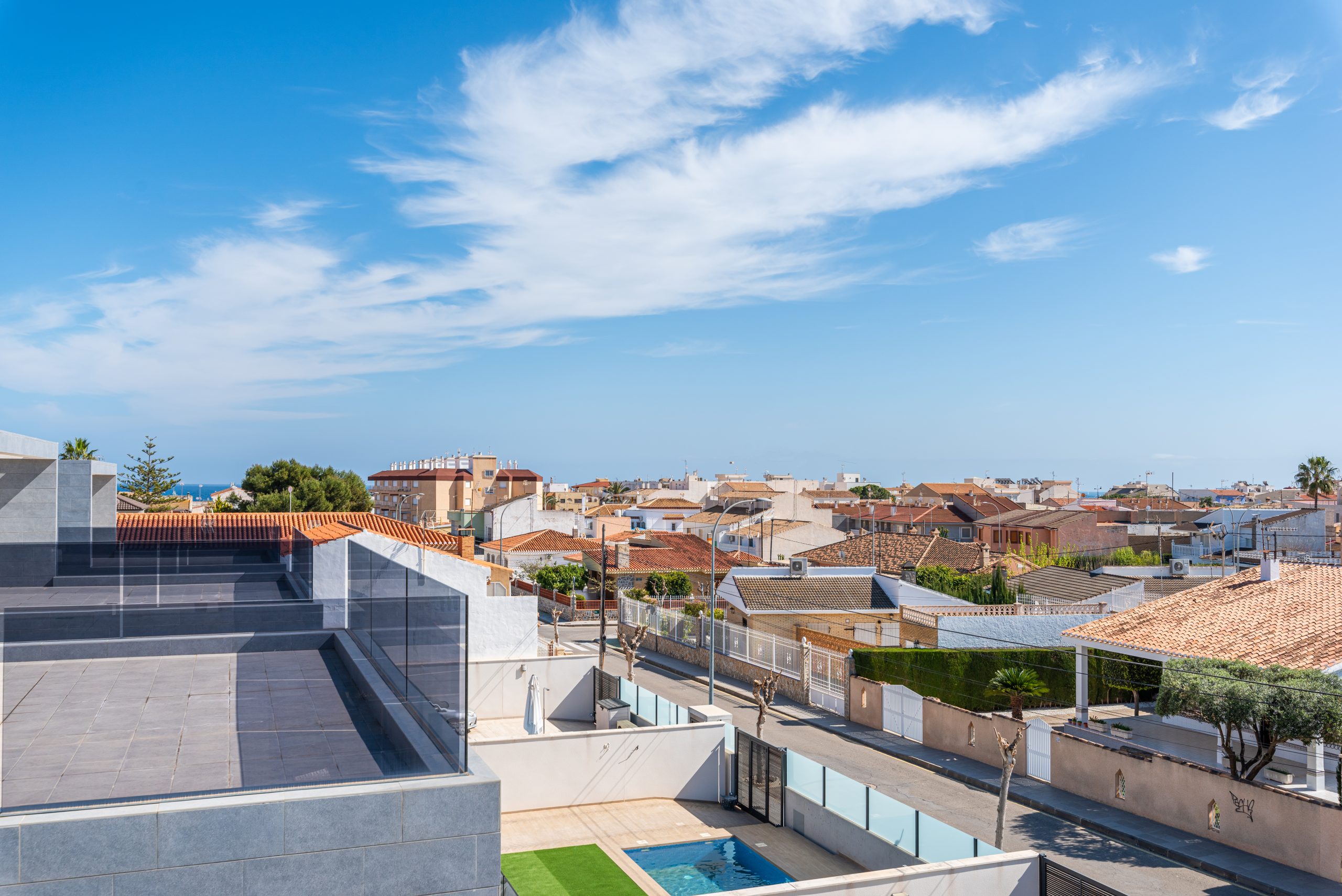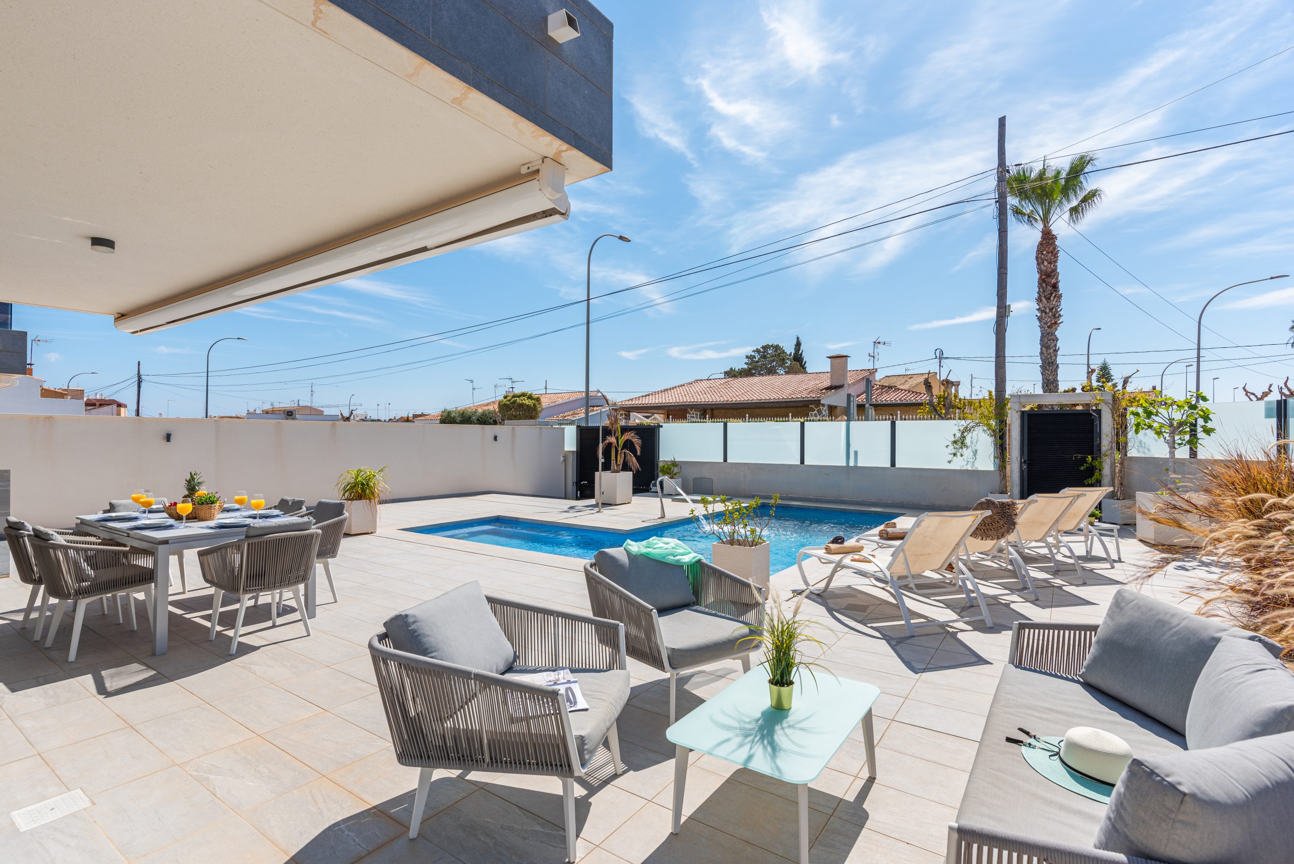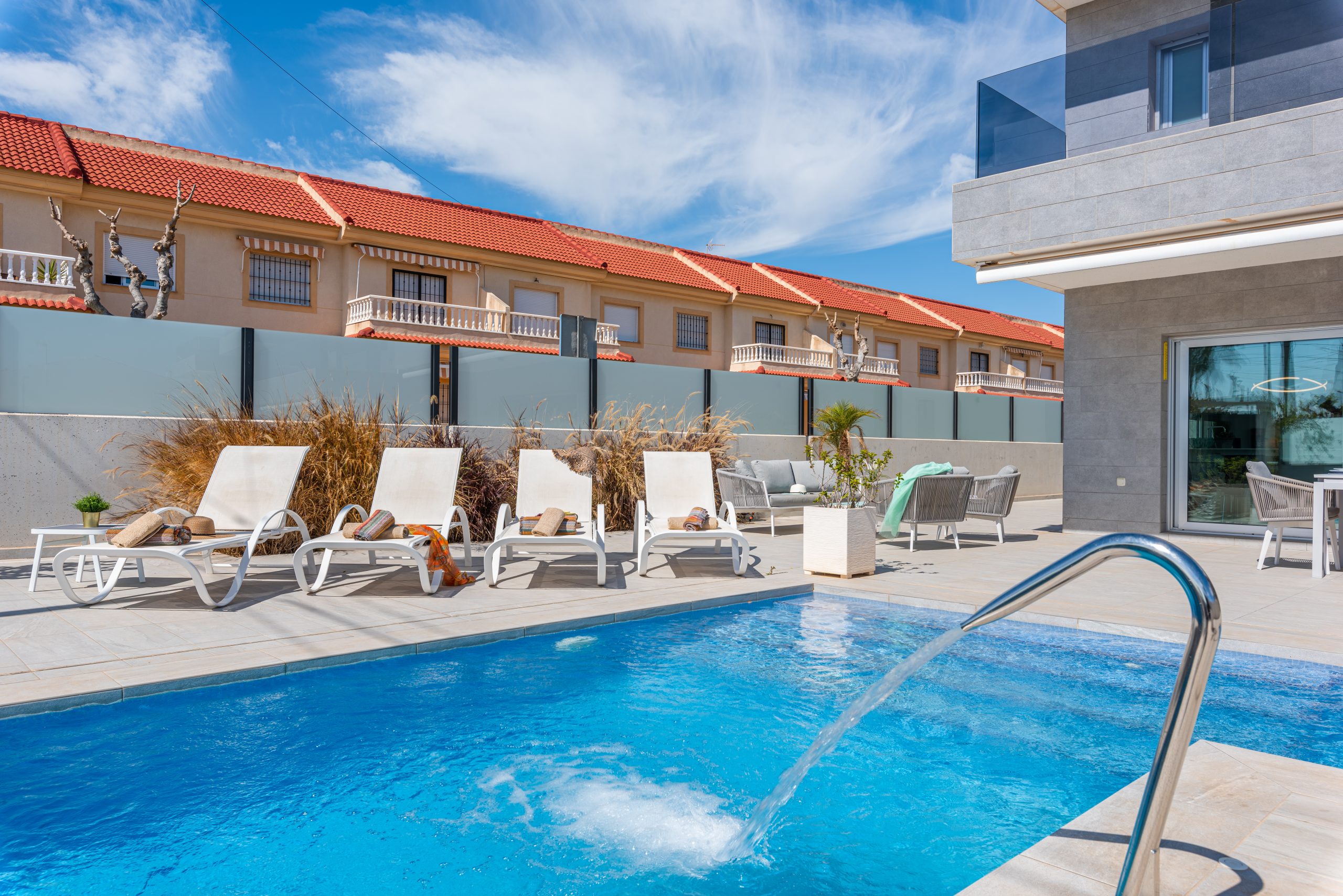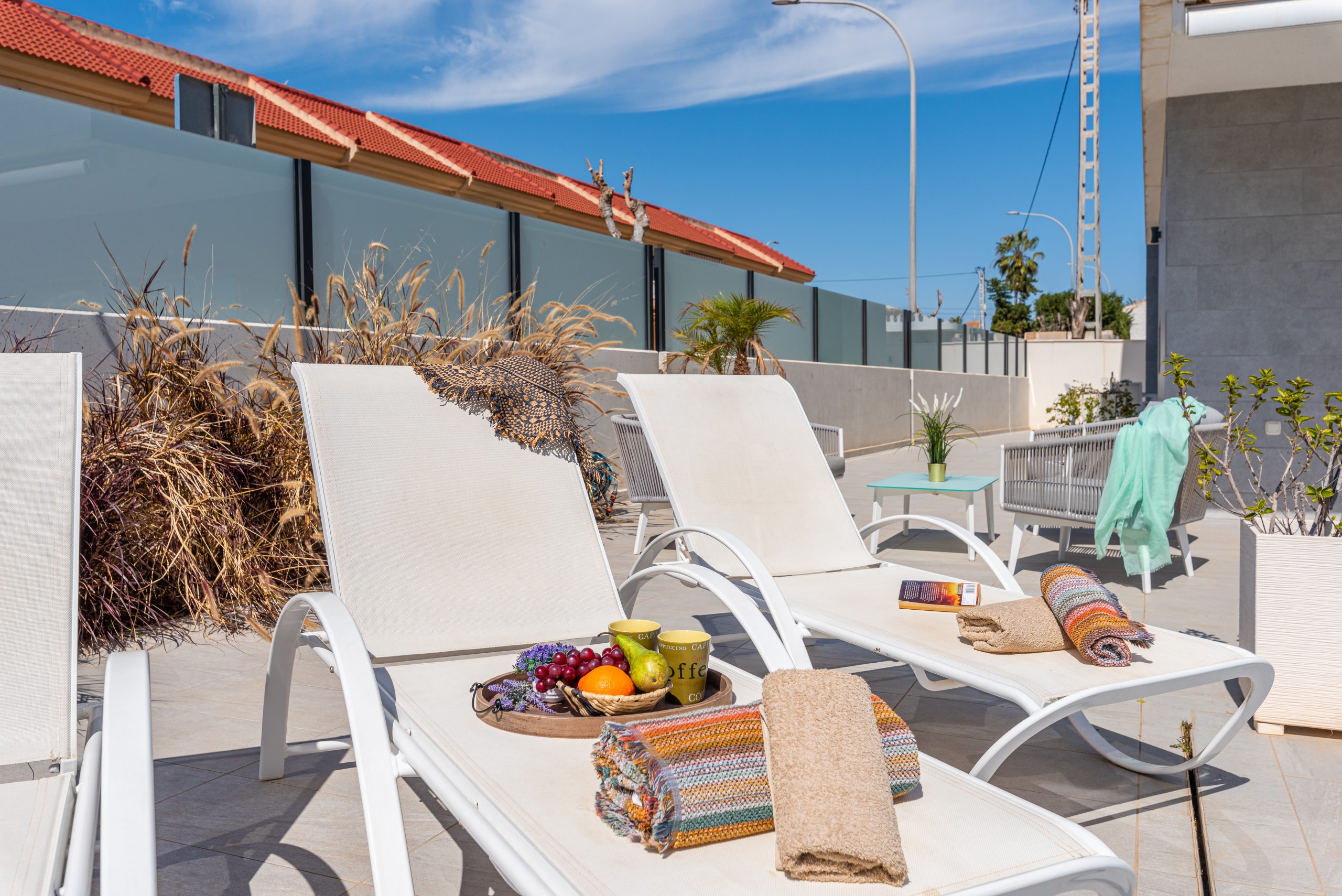 A fantastic five bedroom detached Villa with private pool and spacious terraces both on ground level and on the solarium. The décor is modern, and it is equipped to a very high standard. Located in the sort after town of Torre de la Horadada, just three minutes walk from the golden beaches and the marina. There are numerous bars and restaurants within walking distance, and Latino Square with its array of international restaurants is just a few minutes away. The main town of Pilar Horadada is only five minutes away with supermarkets, a cinema and sports facilities. Air-conditioning, Wi-Fi, and both Scandinavian and English TV are available in this property.