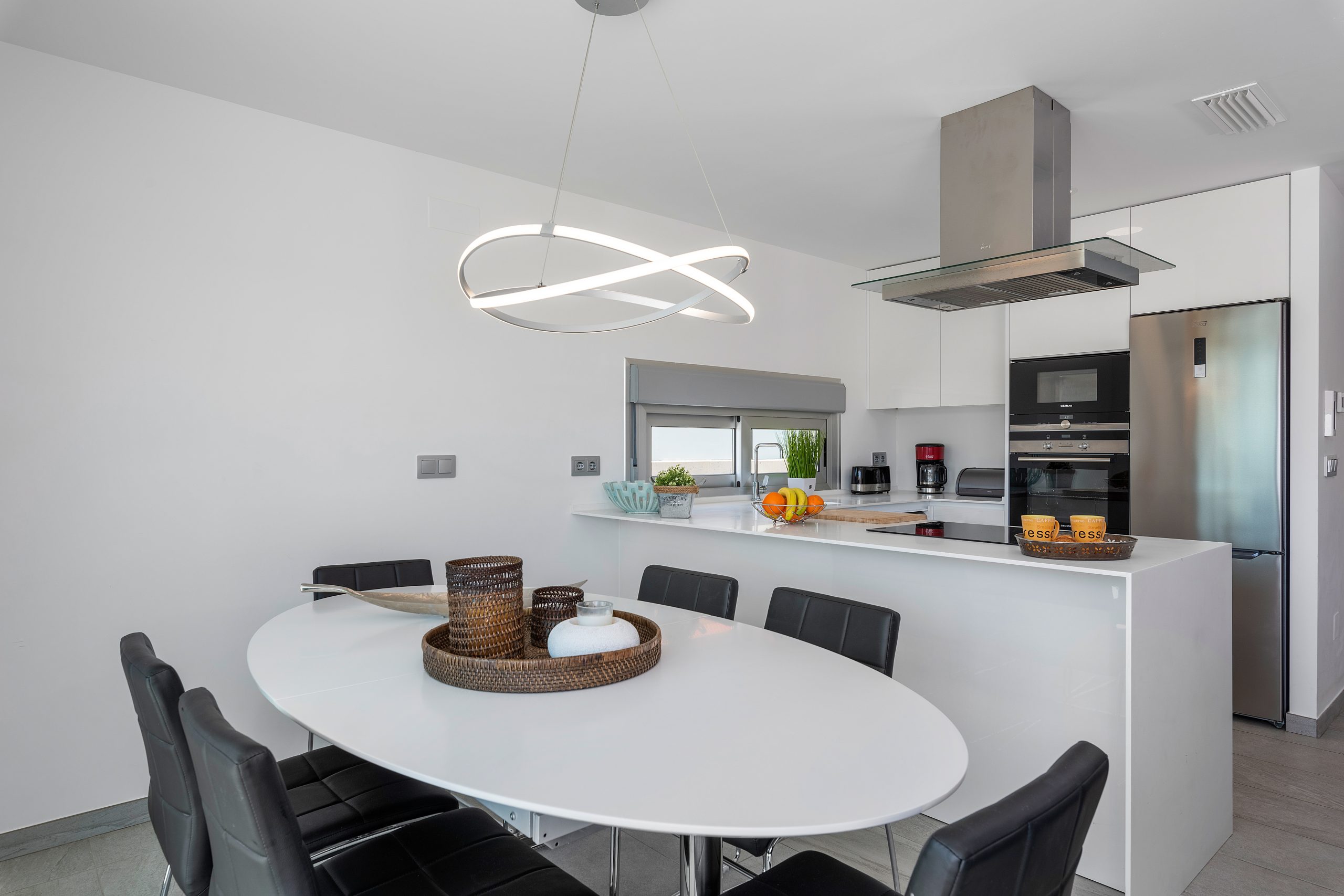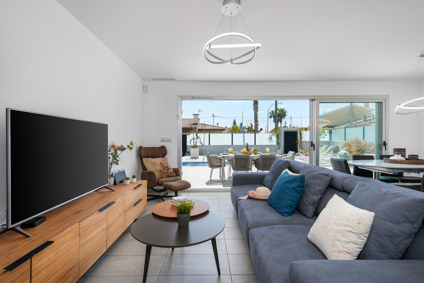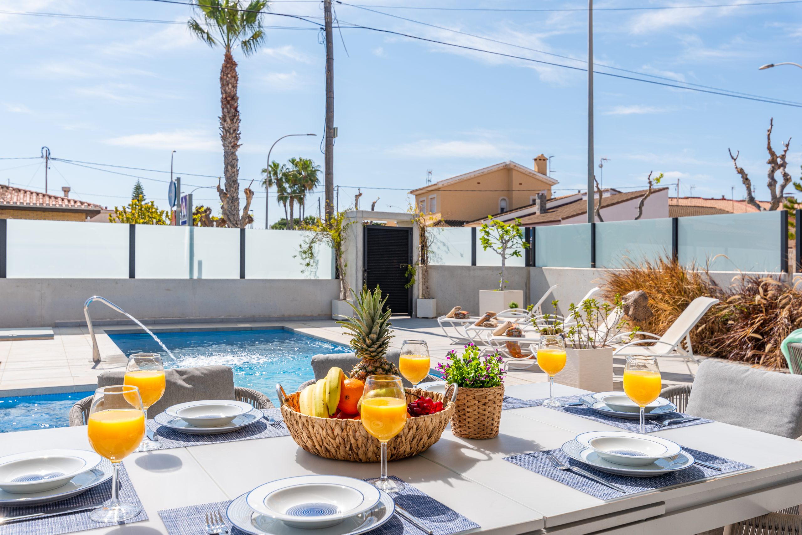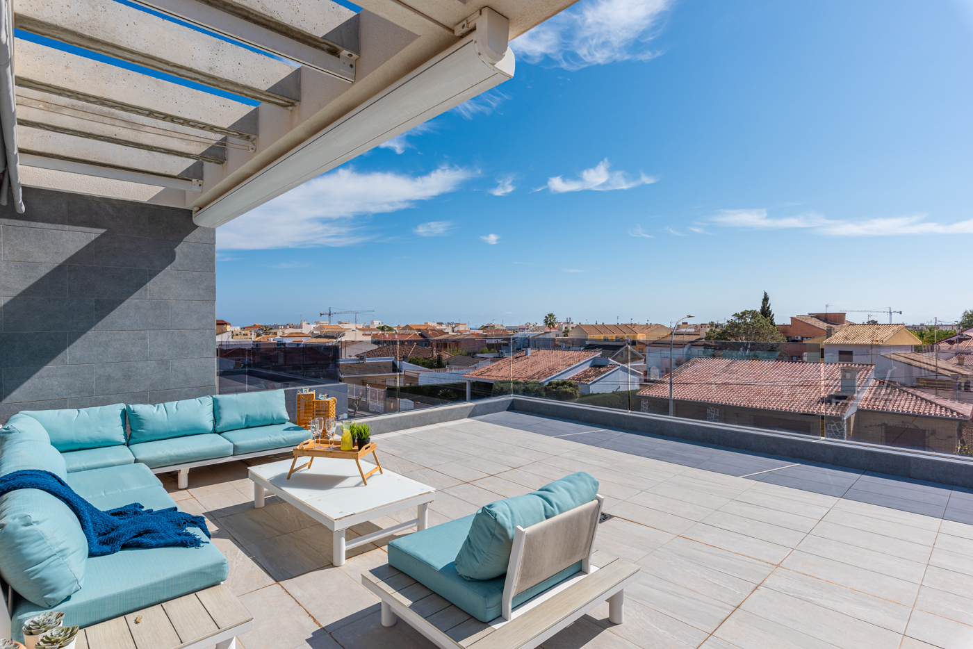 A fantastic five bedroom detached Villa with private pool and spacious terraces both on ground level and on the solarium. The décor is modern, and it is equipped to a very high standard. Located in the sort after town of Torre de la Horadada, just three minutes walk from the golden beaches and the marina. There are numerous bars and restaurants within walking distance, and Latino Square with its array of international restaurants is just a few minutes away. The main town of Pilar Horadada is only five minutes away with supermarkets, a cinema and sports facilities. Air-conditioning, Wi-Fi, and both Scandinavian and English TV are available in this property.